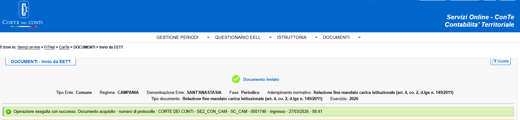 La stessa è stata trasmessa alla Corte dei Conti tramite l'applicativo on line 'ConTe' il 12/08/2025 ed acquisita in pari data (prot. CORTE DEI CONTI - SEZ_CON_CAM - SC_CAM - 0005000 - Ingresso - 27/03/2026 - 08:41).
